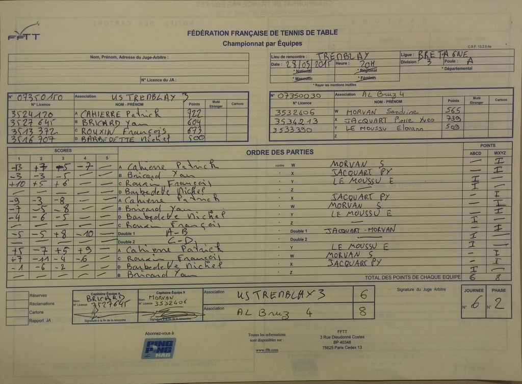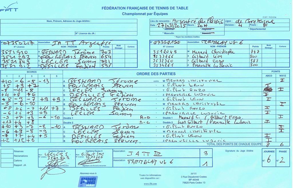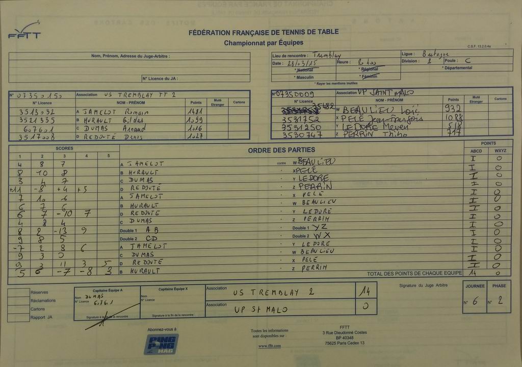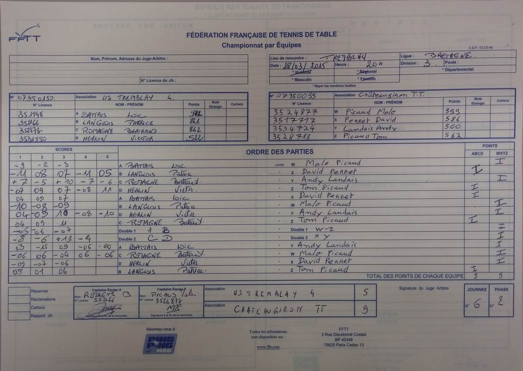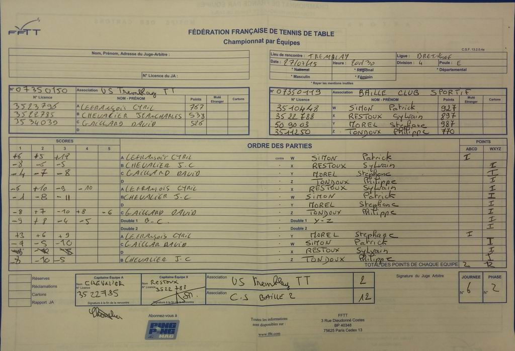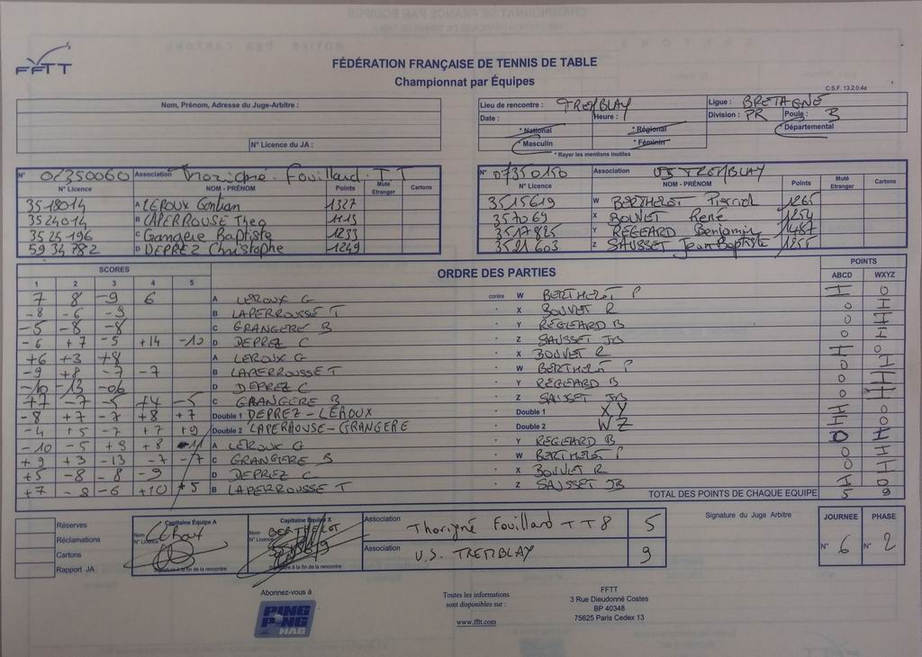 | Détails | Equipe 1 | Pré-Régionale – Poule B | Victoire | 9-5 contre Thorigné Fouillard TT7 |