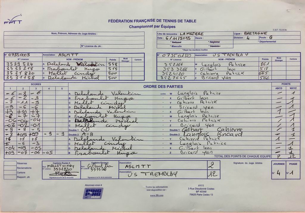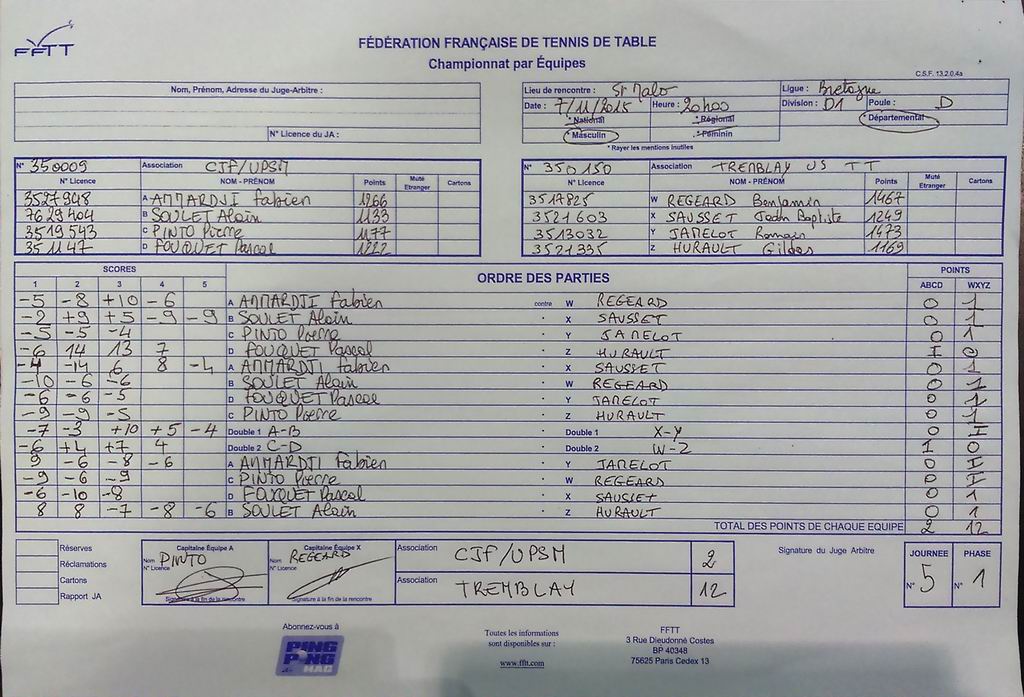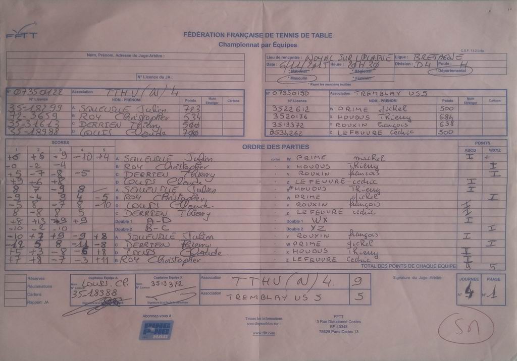 | Détails | Equipe 5 | Division 4 – Poule H | Défaite | 9-5 contre Haute Vilaine TT 4 |