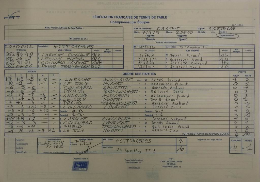| Détails | Equipe 2 | Division 2 – Poule D | Victoire | 10-4 contre Orgères ATT 1 |