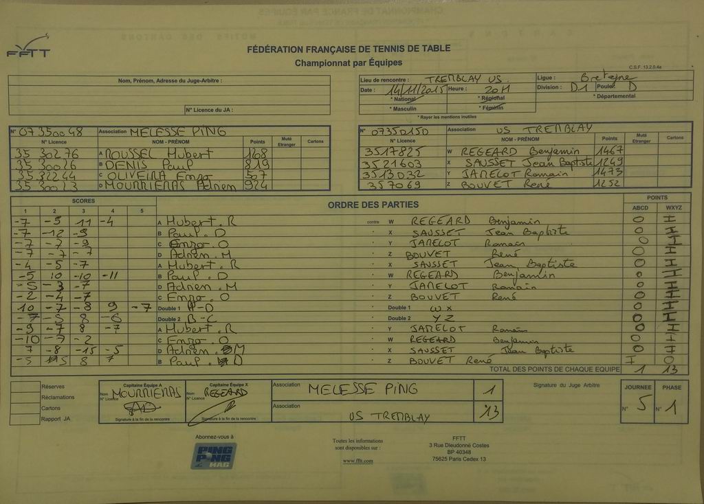 | Détails | Equipe 1 | Division 1 – Poule D | Victoire | 13-1 contre Melesse Ping 2 |