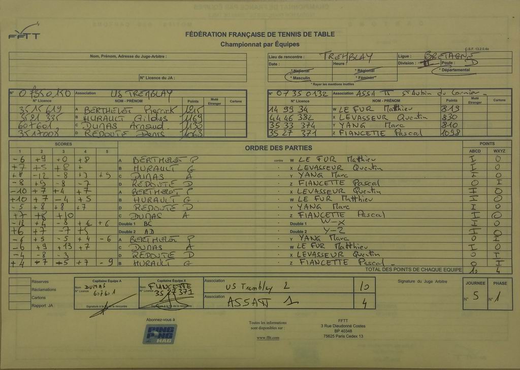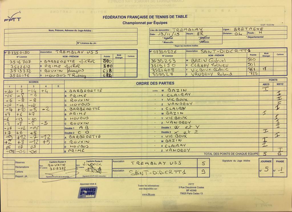 | Détails | Equipe 5 | Division 4 – Poule H | Défaite | 9-5 contre Saint Didier TT 1 |
