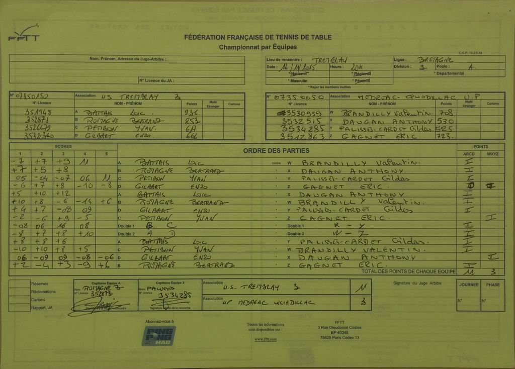 | Détails | Equipe 3 | Division 3 – Poule A | Victoire | 11-3 contre Médréac-Quédillac UP 3 |