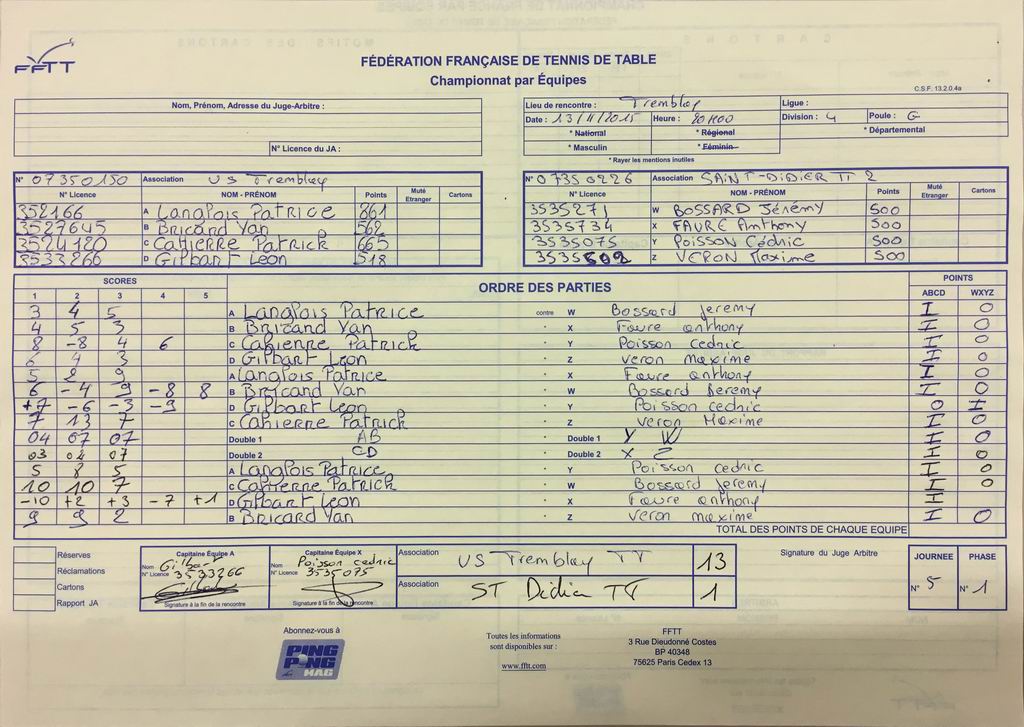 | Détails | Equipe 4 | Division 4 – Poule G | Victoire | 13-1 contre Saint Didier TT 2 |