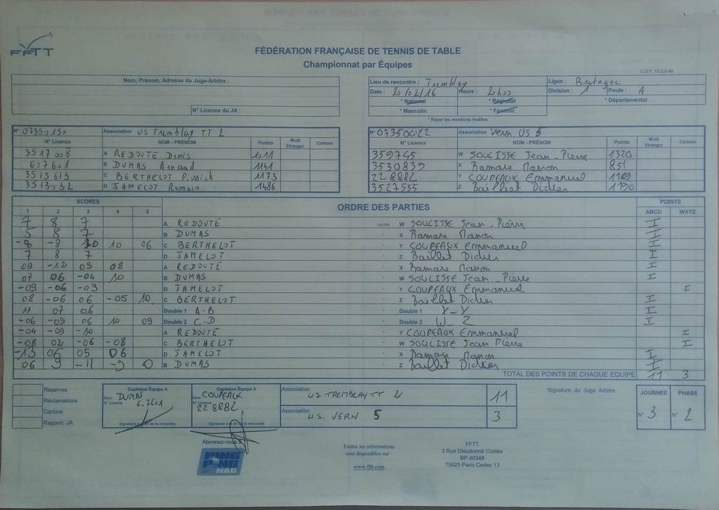 | Détails | Equipe 2 | Division 1 – Poule A | Victoire | 11-3 contre Vern US 5 |