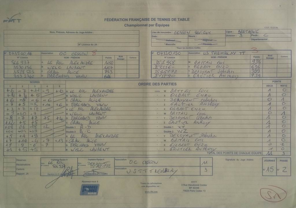 | Détails | Equipe 3 | Division 3 – Poule C | Défaite | 11-3 contre OC Cesson 8 |