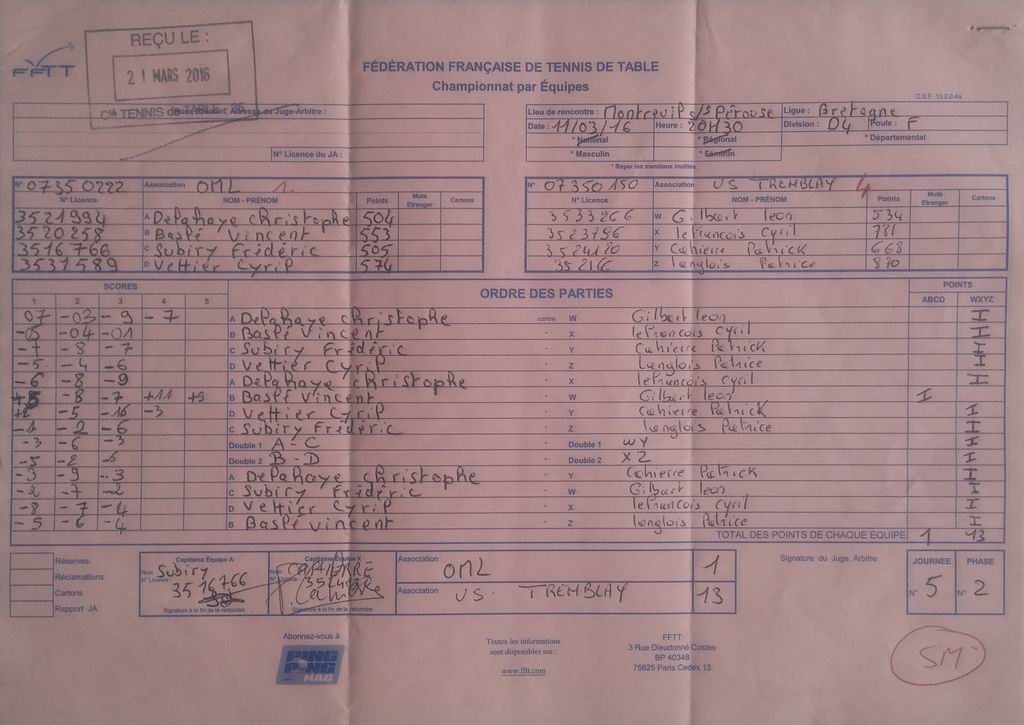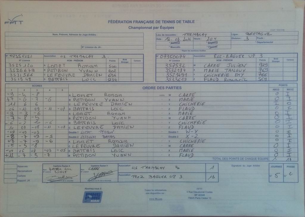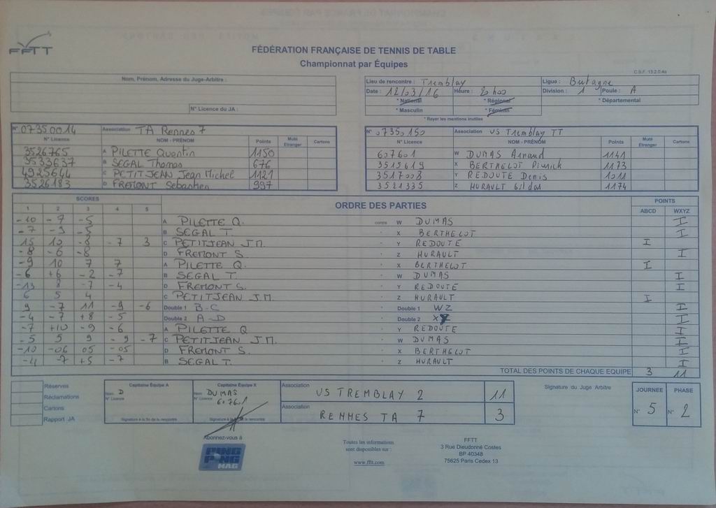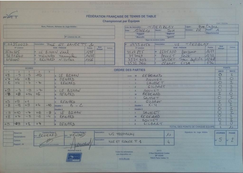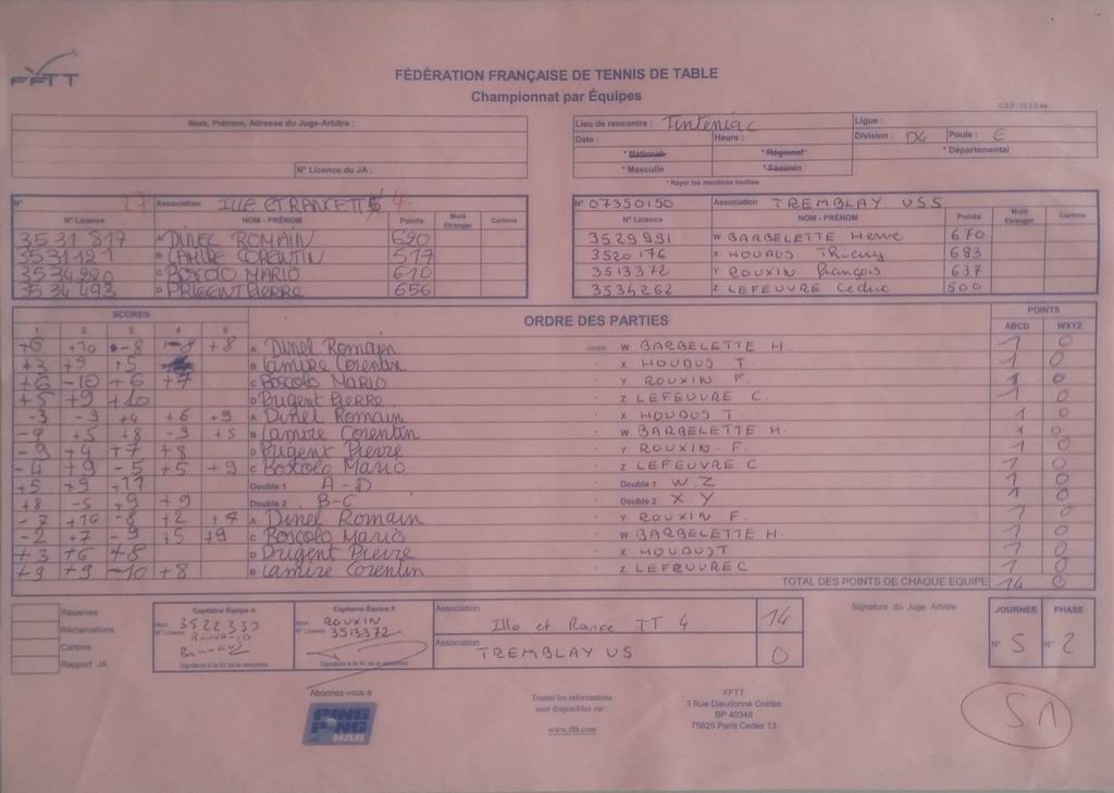 | Détails | Equipe 1 | Pré-Régionale – Poule A | Victoire | 10-4 contre Ille et Rance TT 1 |