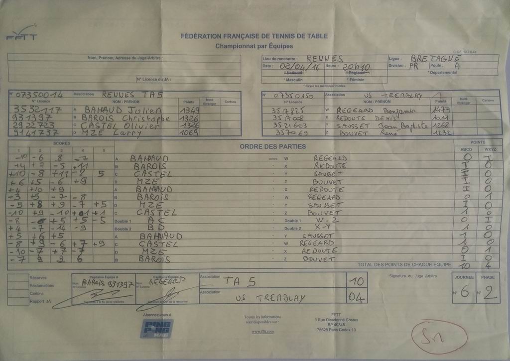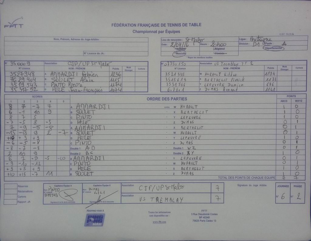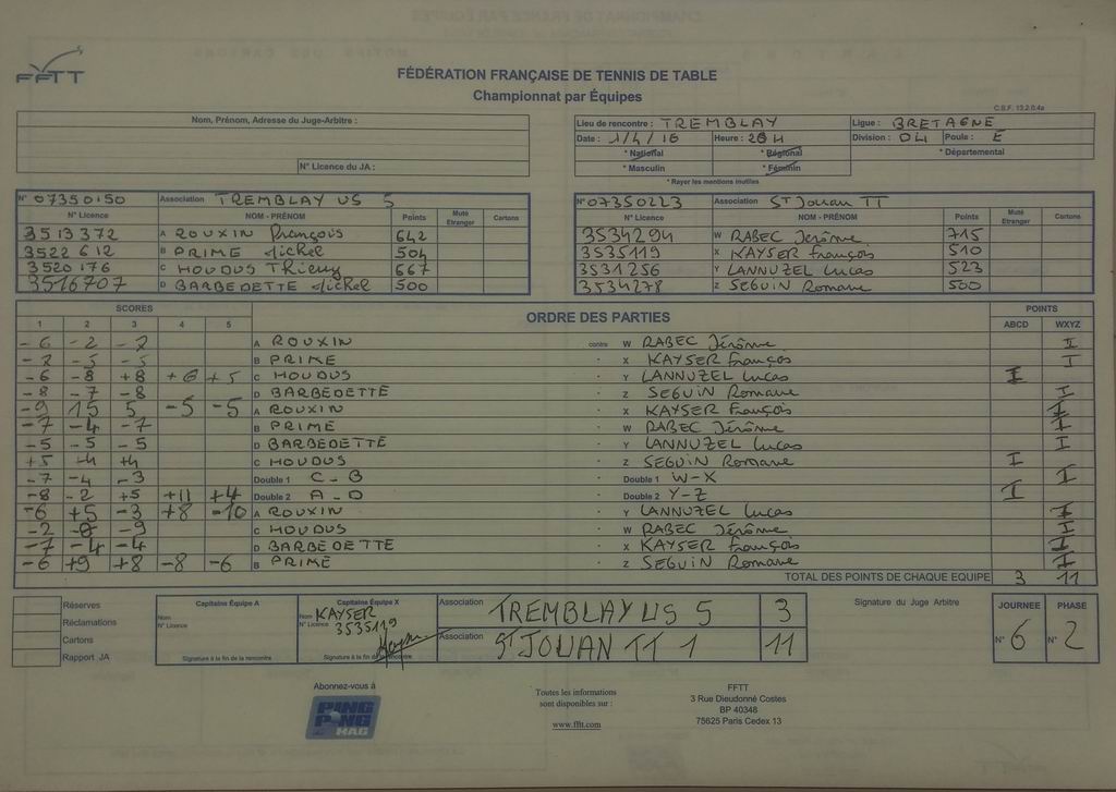 | Détails | Equipe 5 | Division 4 – Poule E | Défaite | 12-2 contre Saint Jouan TT 1 |