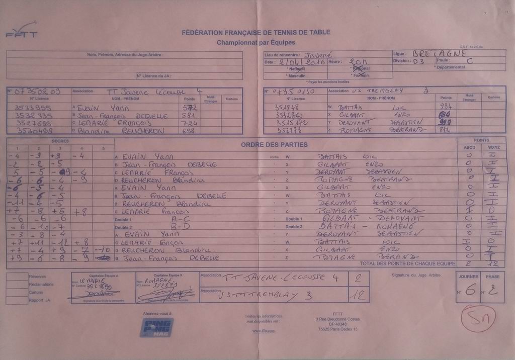 | Détails | Equipe 3 | Division 3 – Poule C | Victoire | 12-2 contre Javené-Lécousse TT 4 |