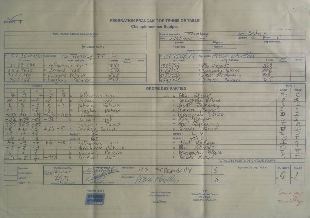 | Détails | Equipe 4 | Division 4 – Poule F | Défaite | 8-6 contre Pong Etrellais 1 |
