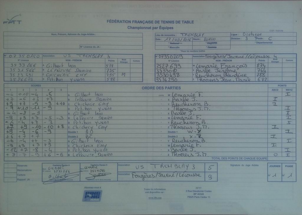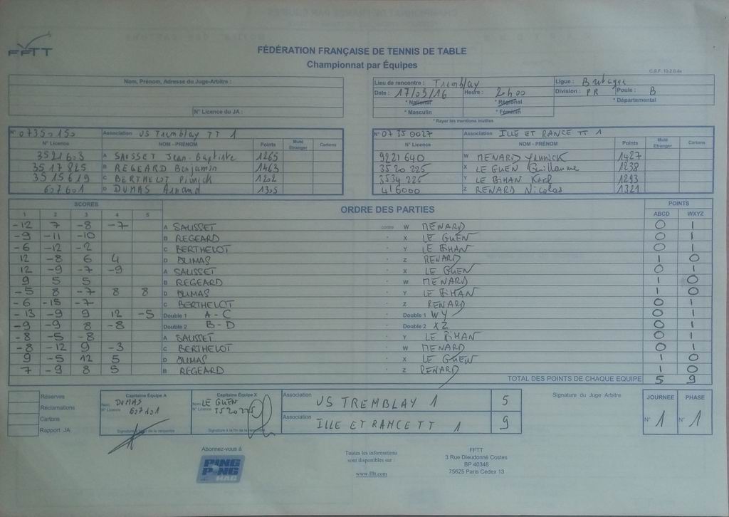| Détails | Equipe 1 | Pré-Régionale – Poule B | Défaite | 9-5 contre Ille et Rance TT 1 |
