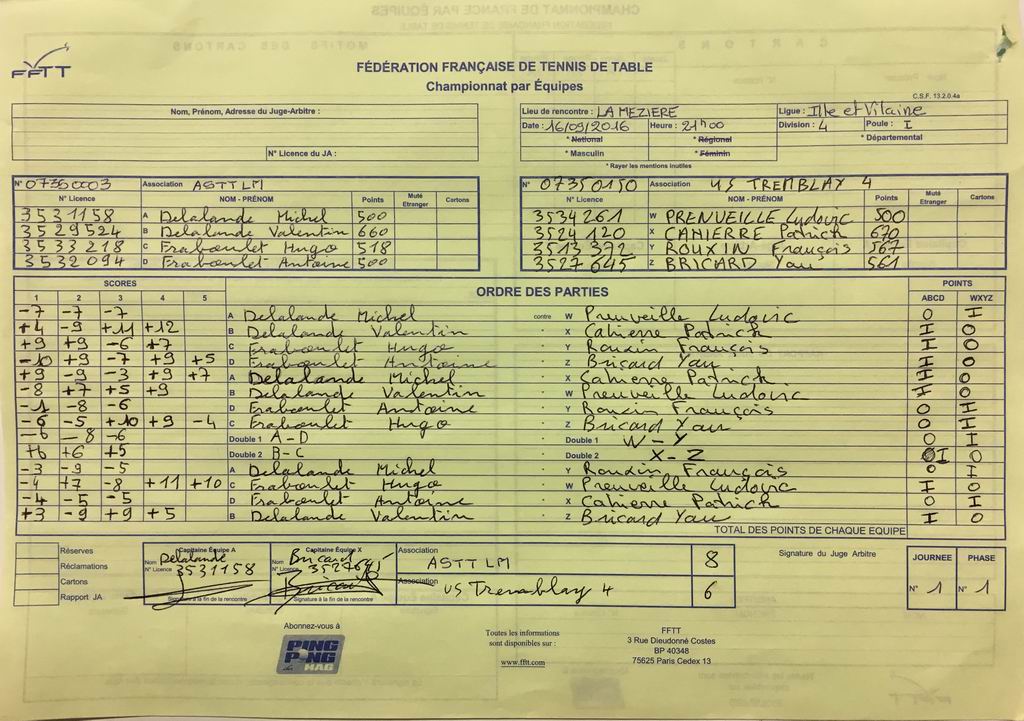 | Détails | Equipe 2 | Division 1 – Poule D | Victoire | 10-4 contre Ille et Rance TT 2 |