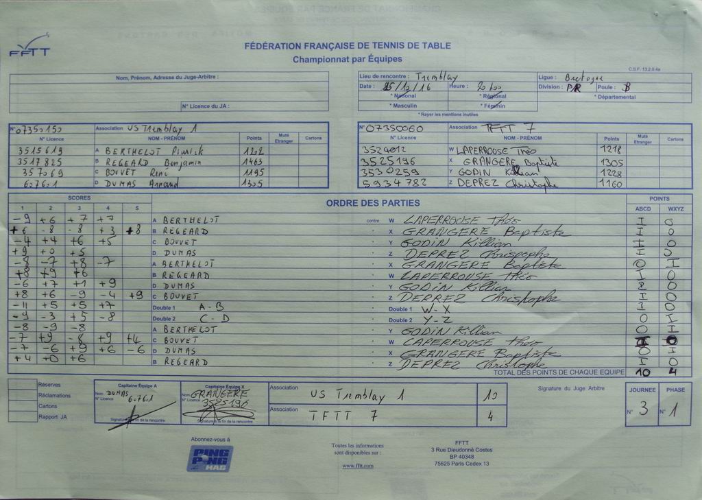 | Détails | Equipe 1 | Pré-Régionale – Poule B | Victoire | 10-4 contre Thorigné TT 7 |