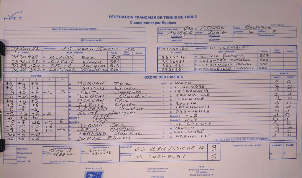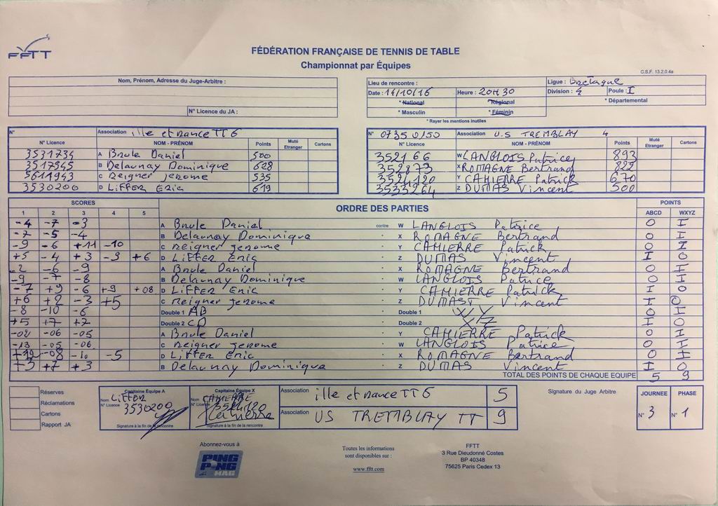 | Détails | Equipe 4 | Division 4 – Poule I | Victoire | 9-5 contre Ille et Rance TT 6 |