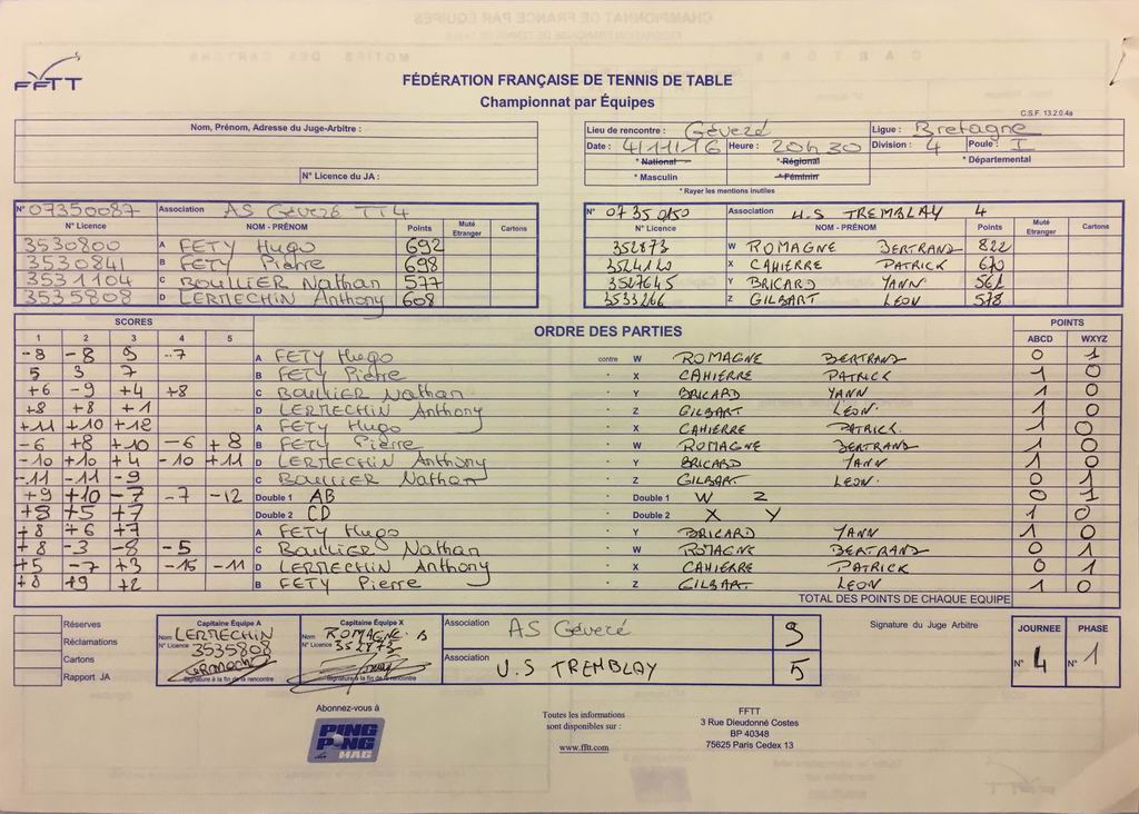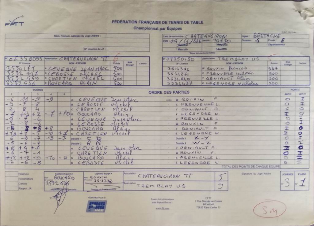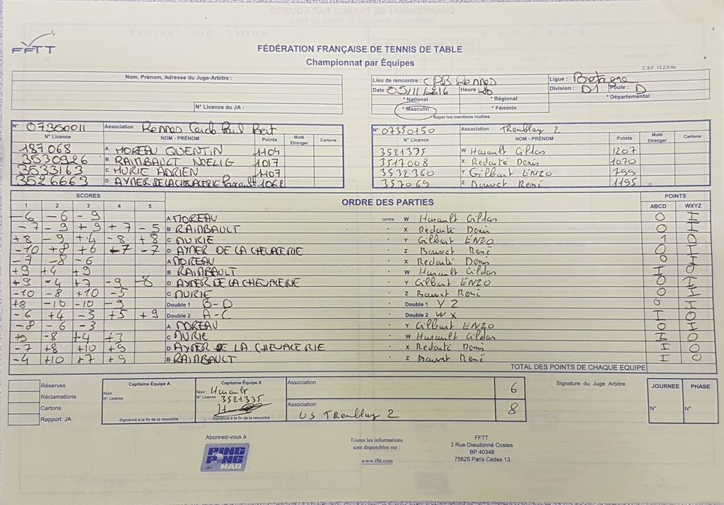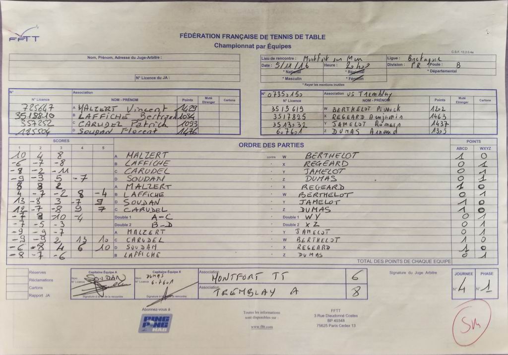 | Détails | Equipe 1 | Pré-Régionale – Poule B | Victoire | 8-6 contre Montfort TT 3 |