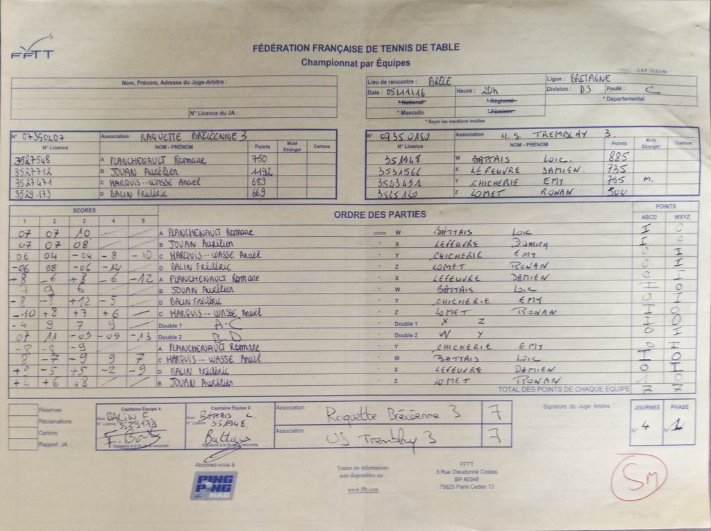 | Détails | Equipe 3 | Division 3 – Poule C | Match nul | 7-7 contre Raquette Brécéenne 3 |