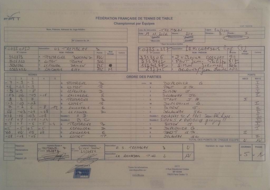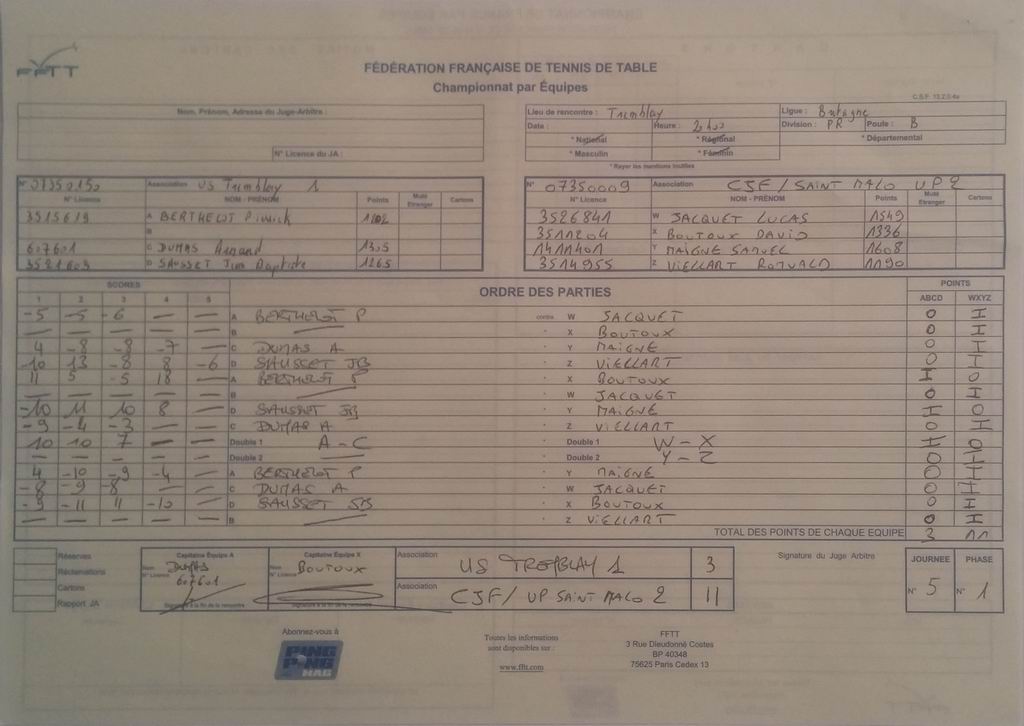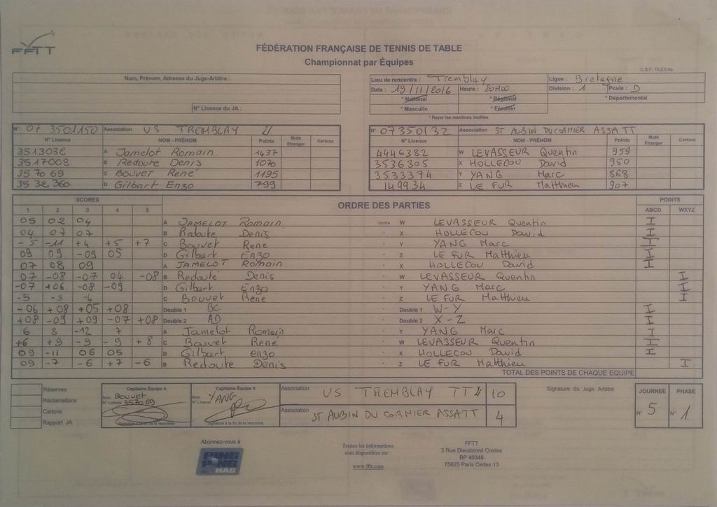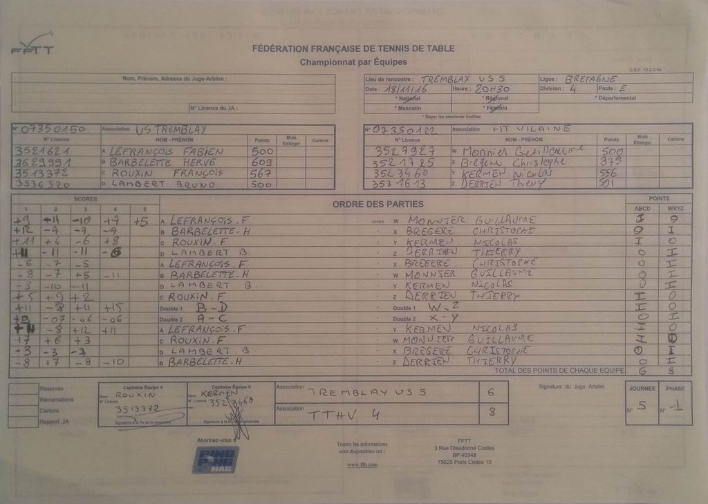 | Détails | Equipe 5 | Division 4 – Poule E | Défaite | 8-6 contre Haute Vilaine TT 4 |