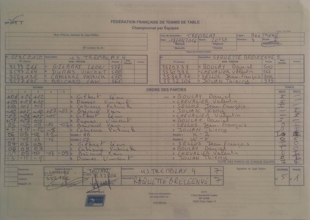 | Détails | Equipe 4 | Division 4 – Poule I | Match nul | 7-7 contre Raquette Brécéenne 5 |