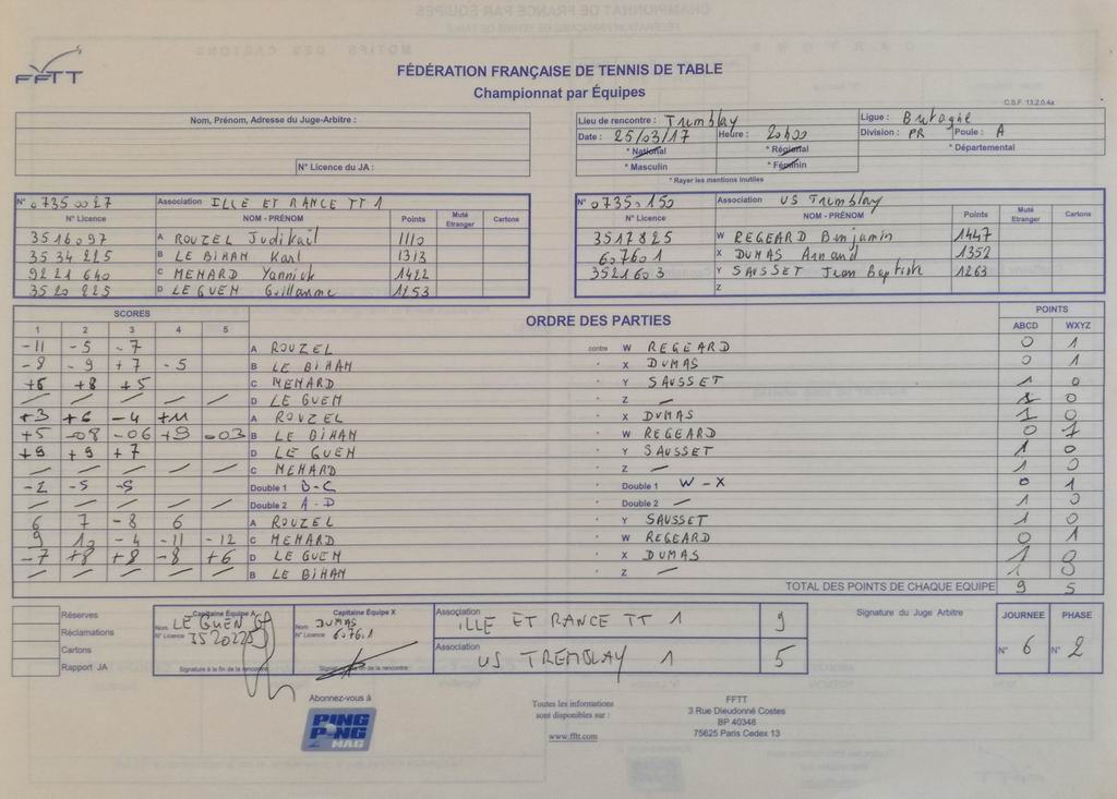 | Détails | Equipe 1 | Pré-Régionale – Poule A | Défaite | 9-5 contre Ille et Rance TT 1 |