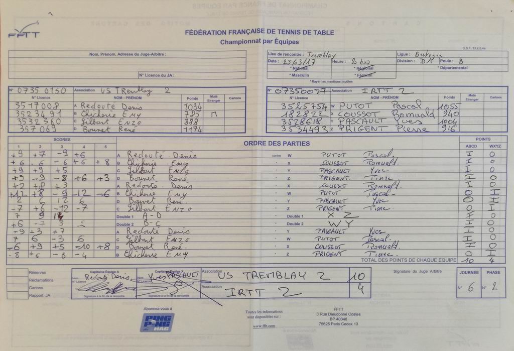 | Détails | Equipe 2 | Division 1 – Poule B | Victoire | 10-4 contre Ille et Rance TT 2 |