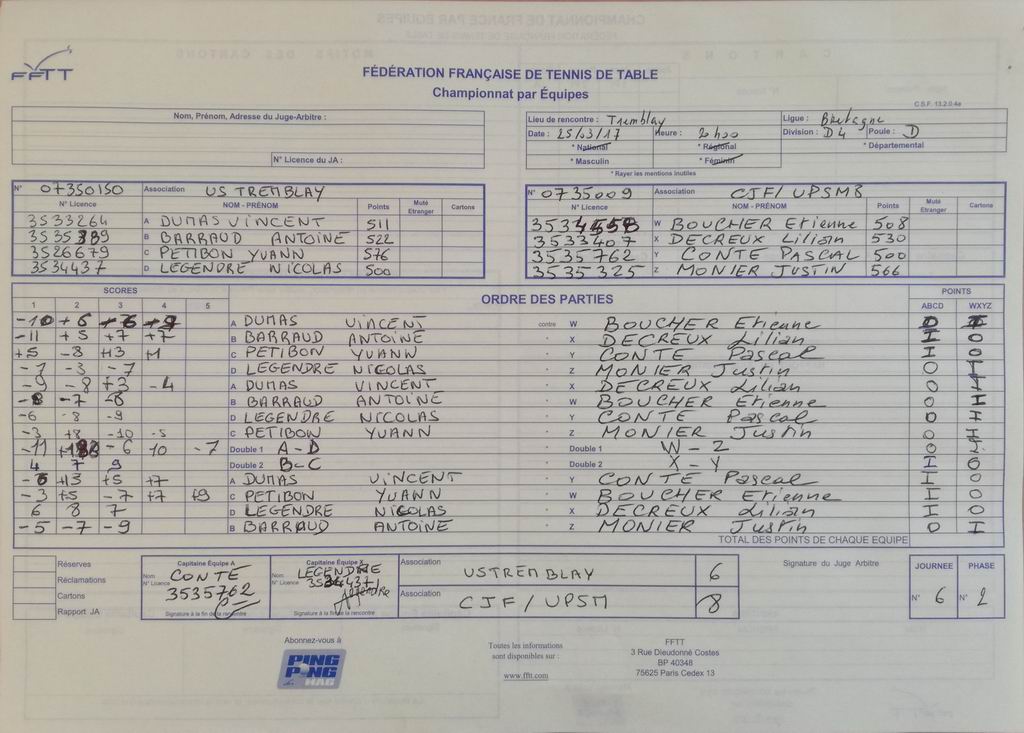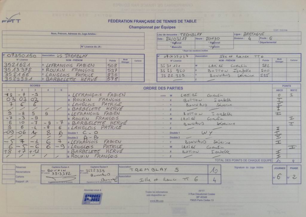 | Détails | Equipe 5 | Division 4 – Poule G | Victoire | 10-4 contre Ille et Rance TT 6 |