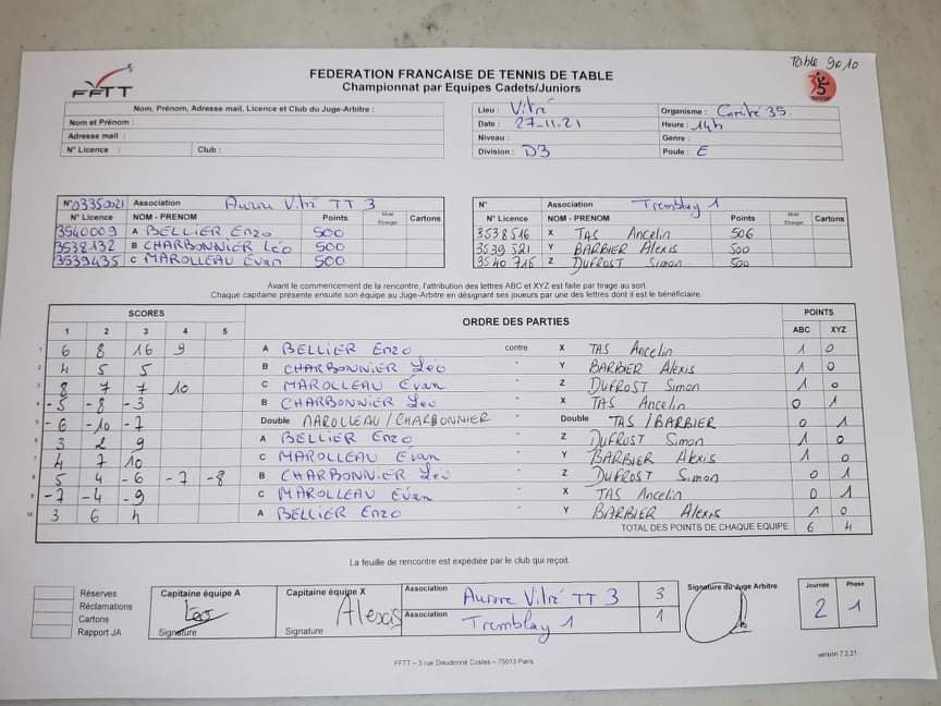 | Details | Equipe cadets / juniors 1 Division 3 – poule E | Défaite 6 – 4 contre Aurore Vitré TT 3 |