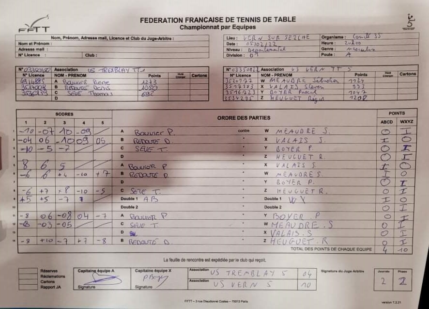 | Détails | Équipe 1 | Division 1 – Poule A | Défaite| 10-4 contre U.S. VERN 5 |