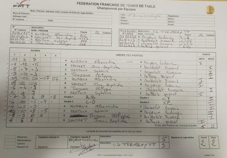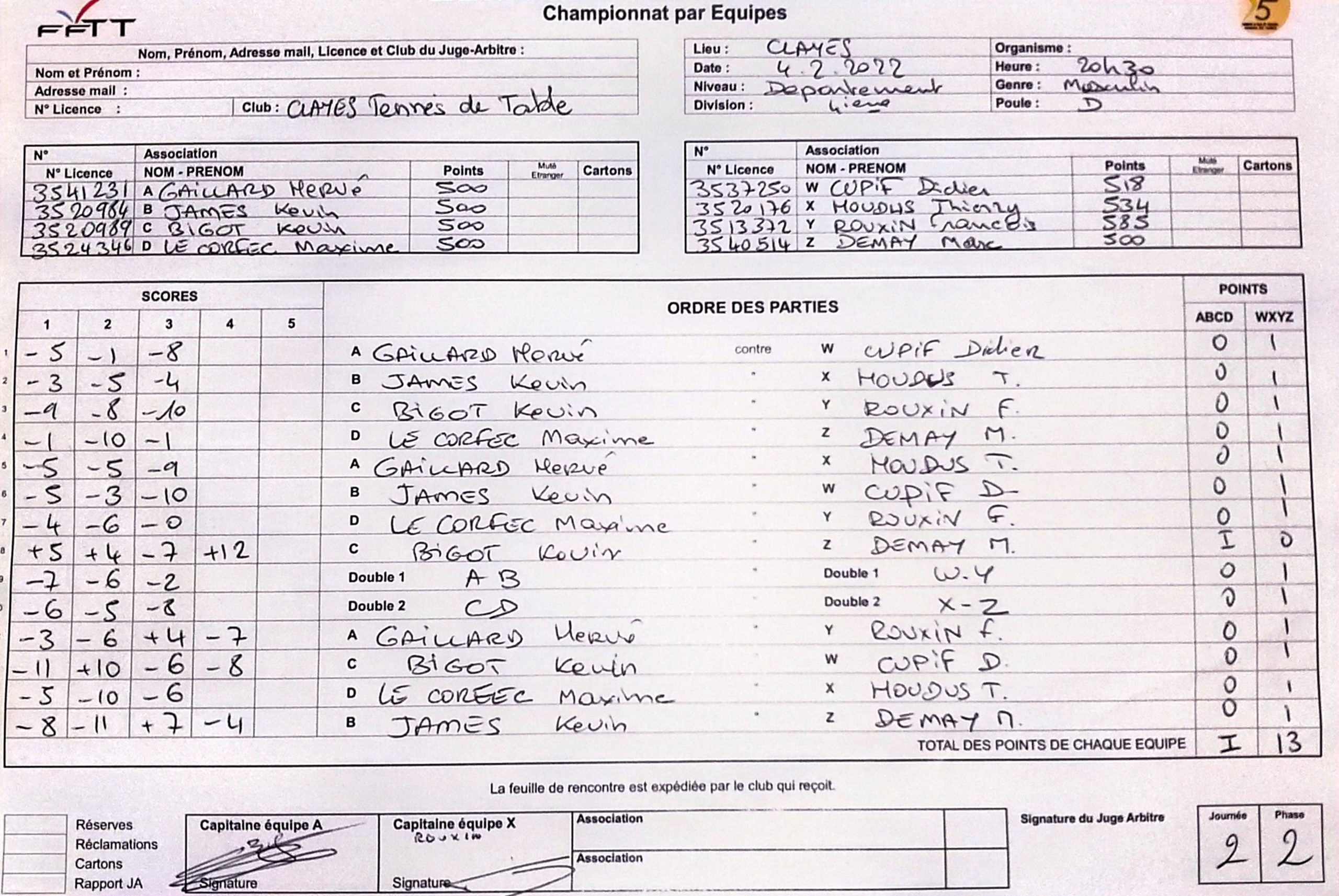 | Détails | Équipe 4 | Division 4 – Poule D | Victoire| 13 – 1 contre CLAYES TT 1 |