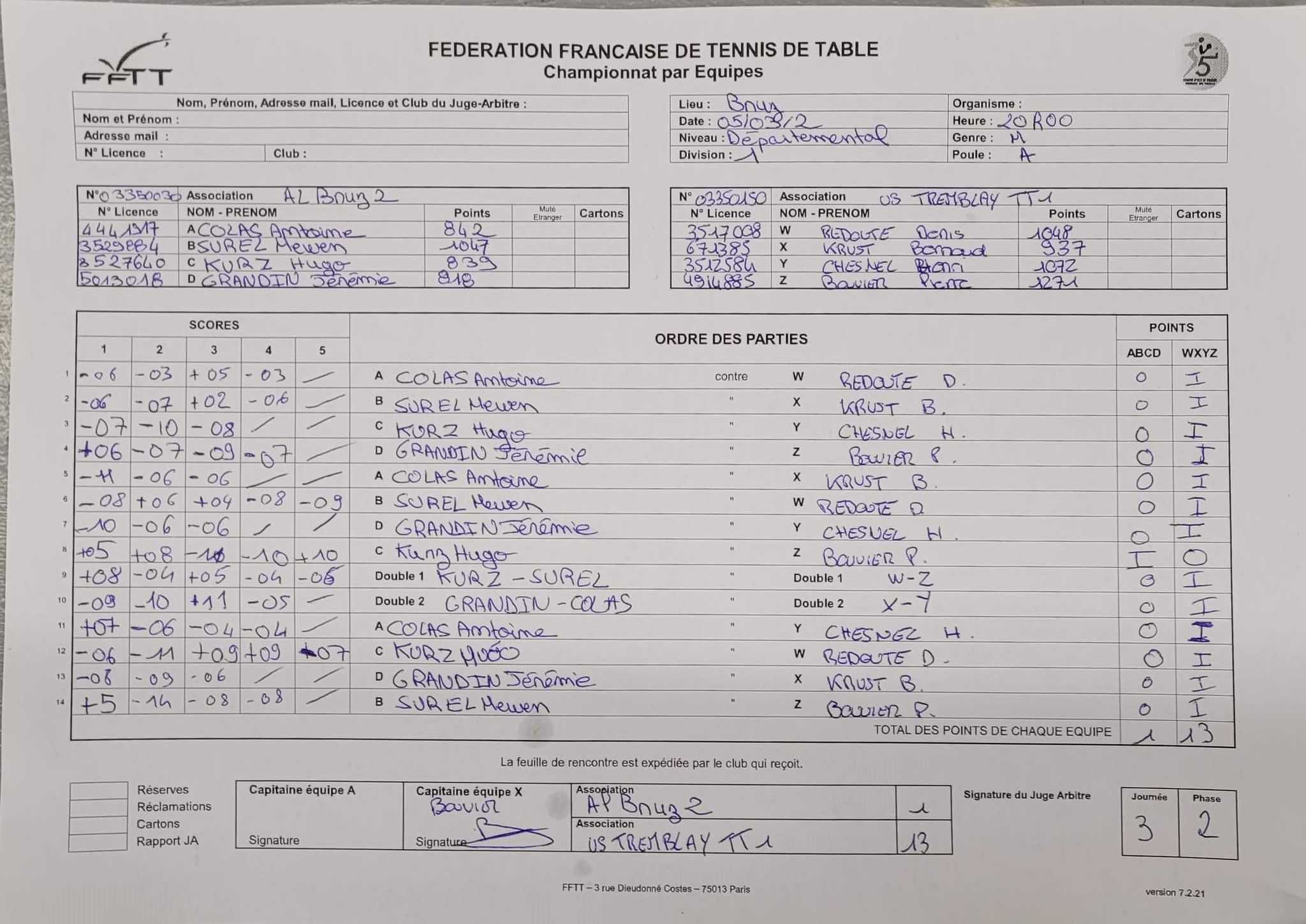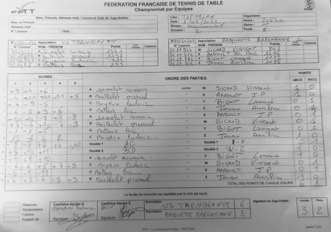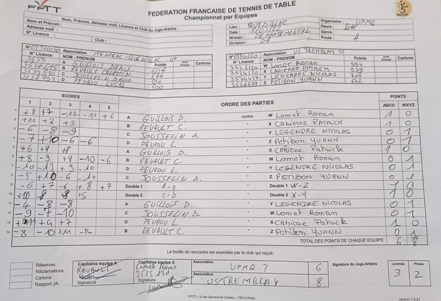 | Détails | Équipe 3 | Division 4 – Poule A | Victoire| 8 – 6 contre U P M Q 2 |