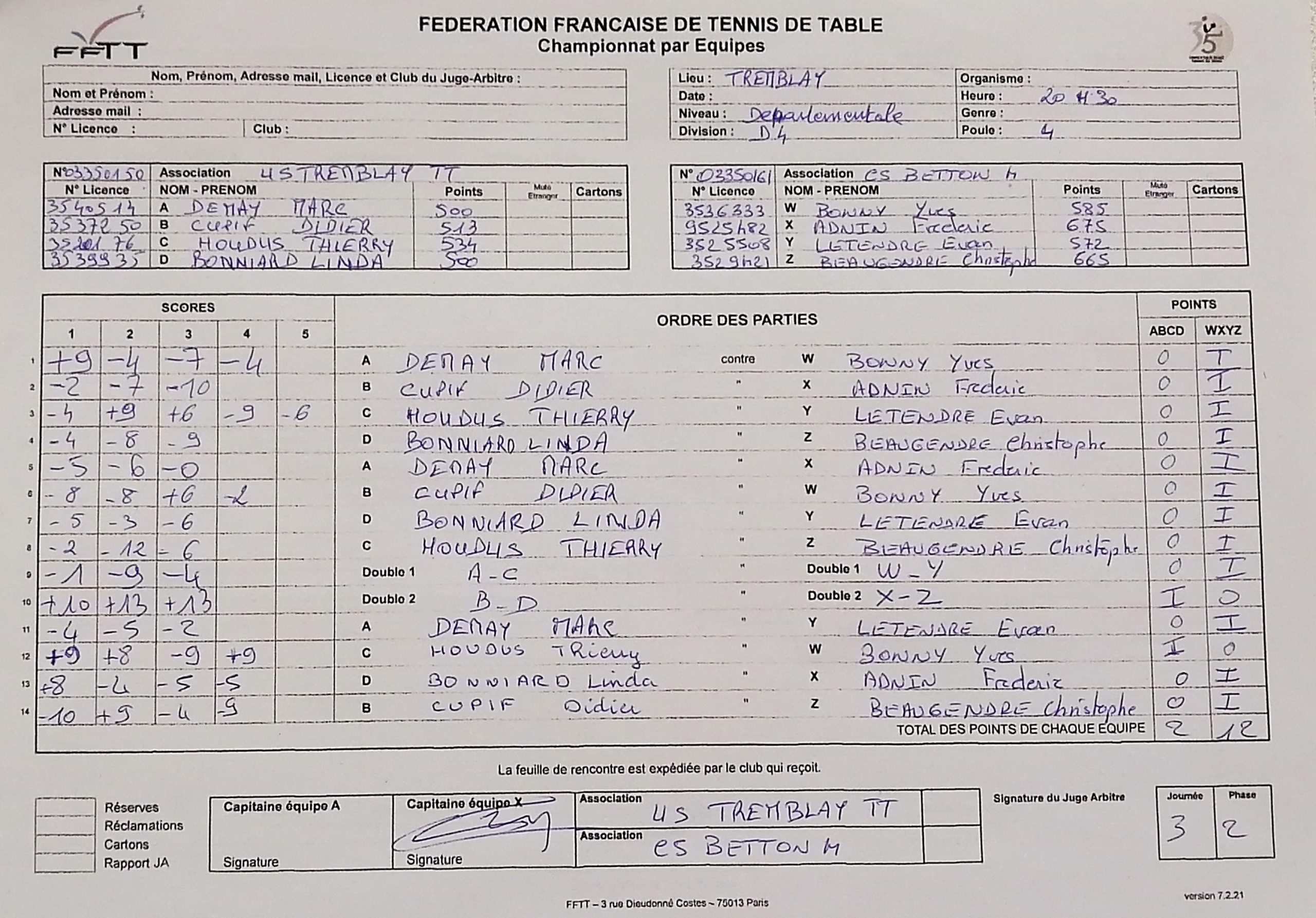 | Détails | Équipe 4 | Division 4 – Poule D | Défaite| 12 – 2 contre BETTON 4 |